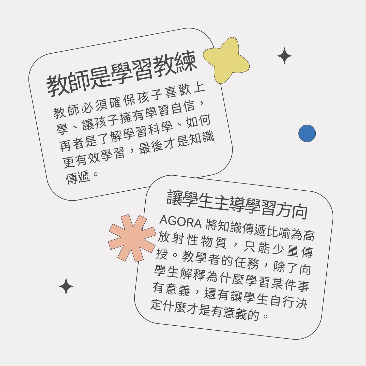 在Agora,我們相信所謂的成功是『對社會的貢獻』而不是學業成就,也就是『共同成功和讓彼此幸福的使命』,成功不是個人的功勞,所以成功的人有責任給予其他人實現成功的機會。