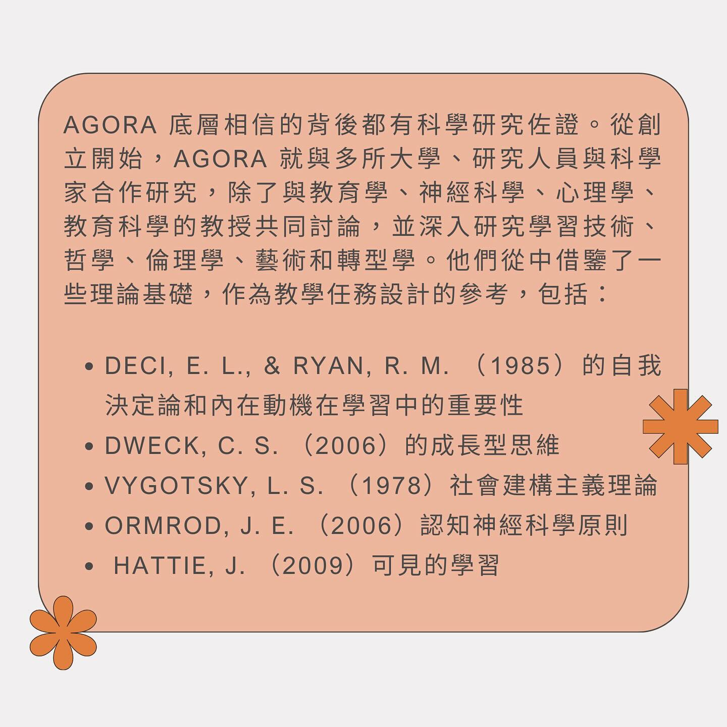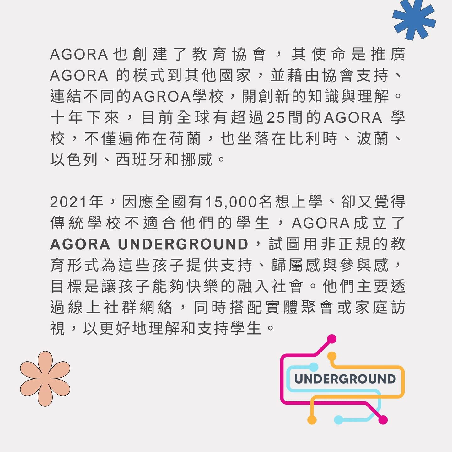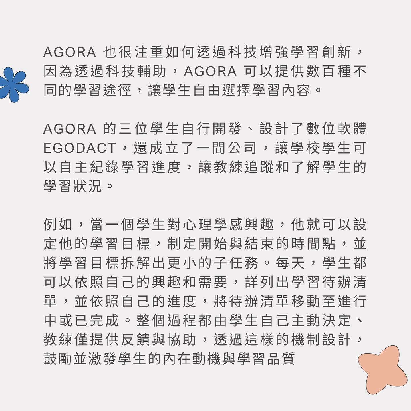 Agora 為希臘語中的市集,原意指古希臘羅馬城中人們聚集、交易、討論事物的社會經濟文化中心。Agora 期待學生能在這裡相遇,增長自我認知、發現自己的力量、熱情和前所未見的可能性。